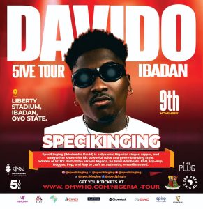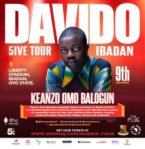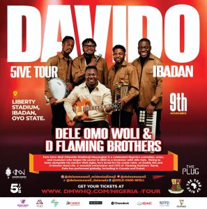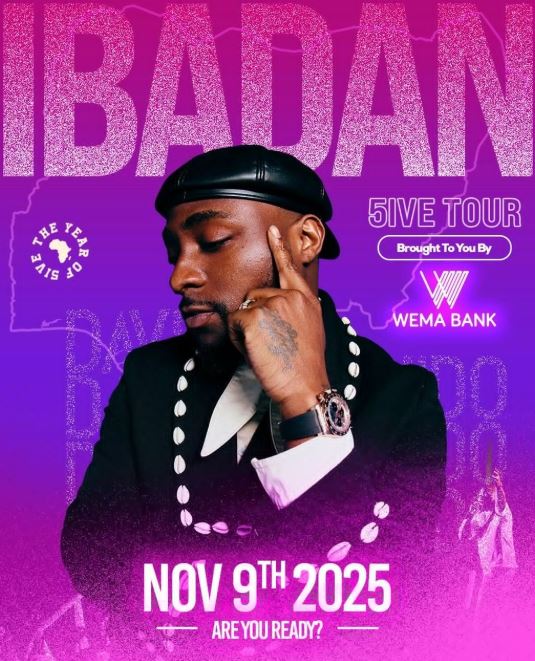 Get ready to vibe out Ibadan! Come this Sunday (9-11-20235)The #Wema5iveAliveTour is coming to Ibadan, by the OBO himself Tagged: Davido 5IVE. This mega Davido Mega concert fiesta is set to be the biggest show in the city of Ibadan.